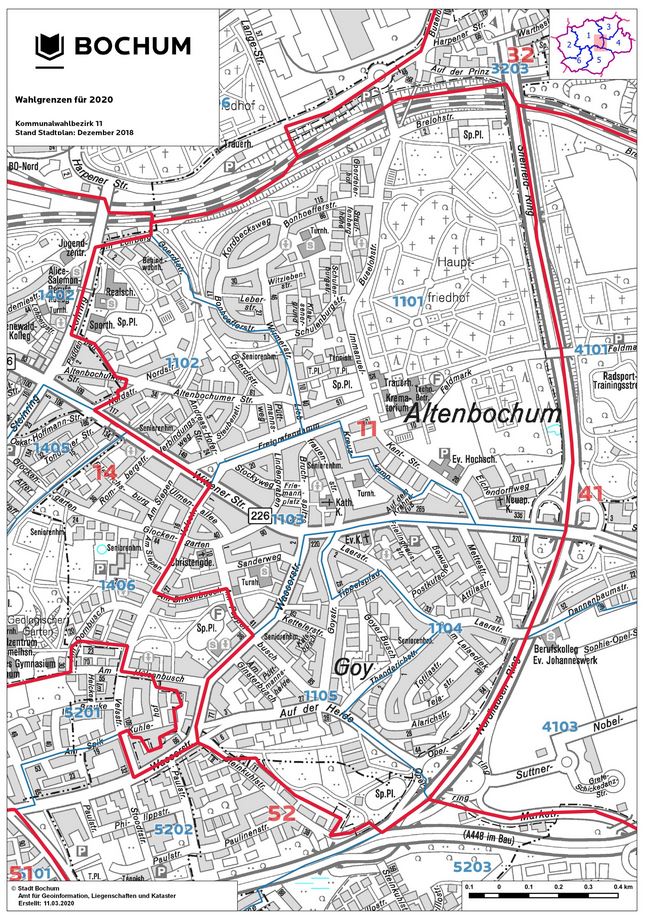 Heute leben in Altenbochum, das zum Bezirk Mitte gehört, rund 12.000 Menschen. Die Mehrheit davon ist weiblich. 13,3 % der hier wohnenden Menschen sind unter 18 Jahre. Altenbochum hat eine Fläche von gut drei Quadratkilometern, wobei die räumlich-regionale Abgrenzung des Stadtteils nicht identisch mit dem Wahlkreis – Wahlkreis 11 – ist.